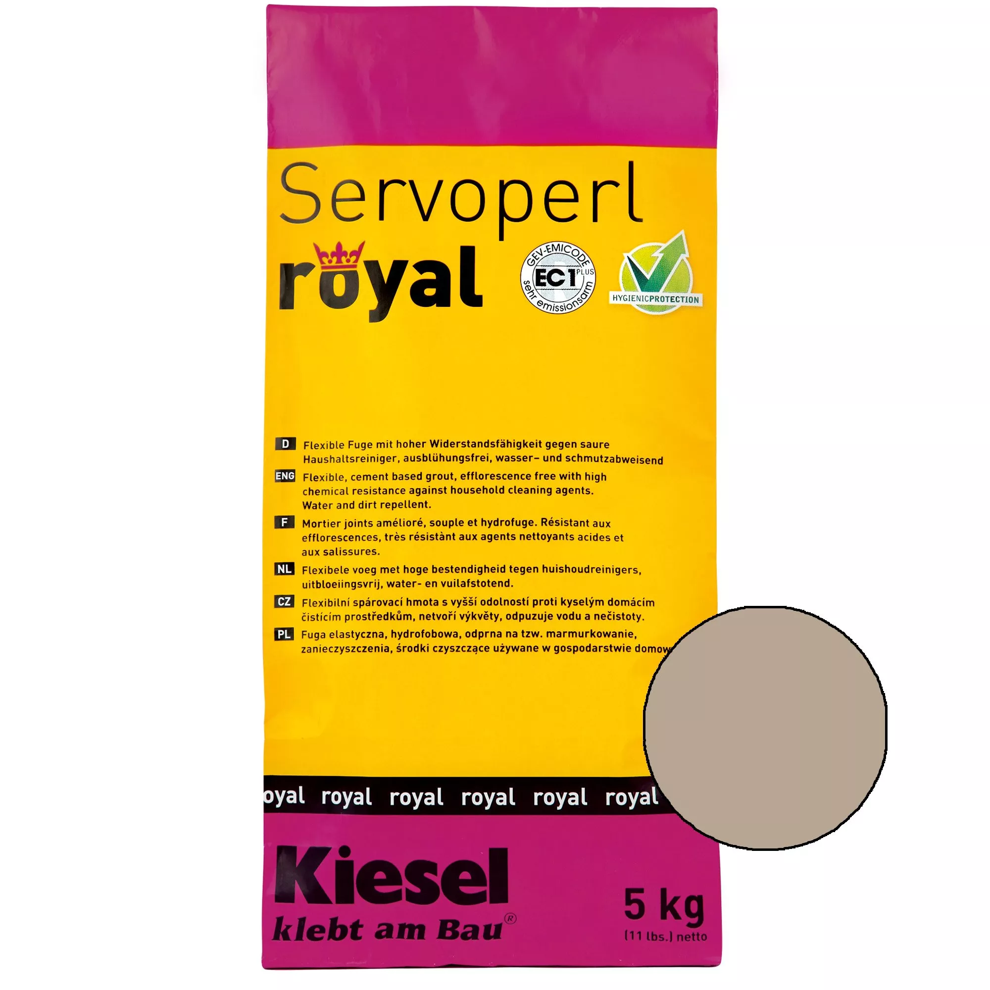 Kiesel Servoper royal to zaprawa do spoin o wysokiej wytrzymałości zgodna z normą DIN EN 13888 CG 2 WA. Zaprawą cementową można wypełnić spoinę o szerokości od 1 do 10 mm. Spoina otrzymuje wraz z zaprawą dużą wytrzymałość mechaniczną. Spoin