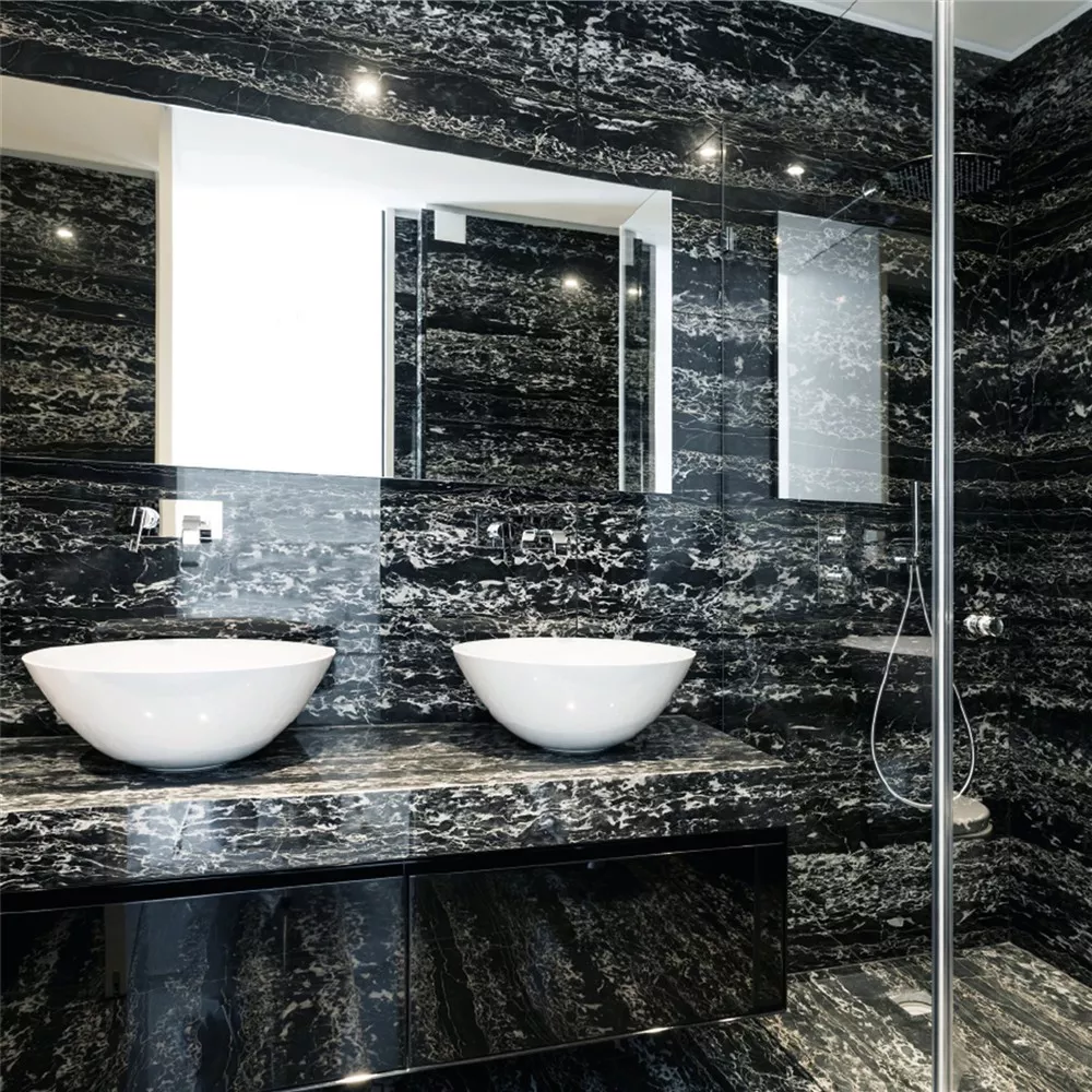 Dzięki płytce z kamienia naturalnego Discovery Nero Galactica 60x60, która jest również polerowana, każdą łazienkę można odświeżyć wizualnie. Nawet jeśli jest używane ogrzewanie podłogowe lub w łazience robi się trochę chłodniej, te płytki podłogowe o wyglądzie naturalnego kamienia mogą wytrzymać te wahania temperatury. Wygląd płytek z kamienia naturalnego, gdy czerń spotyka się z światłem Polerowane wykończenie szlachetnych płytek kamionkowych lub płytek podłogowych naprawdę sprawdza się tylko wtedy, gdy pomyślano o odpowiednim oświetleniu.