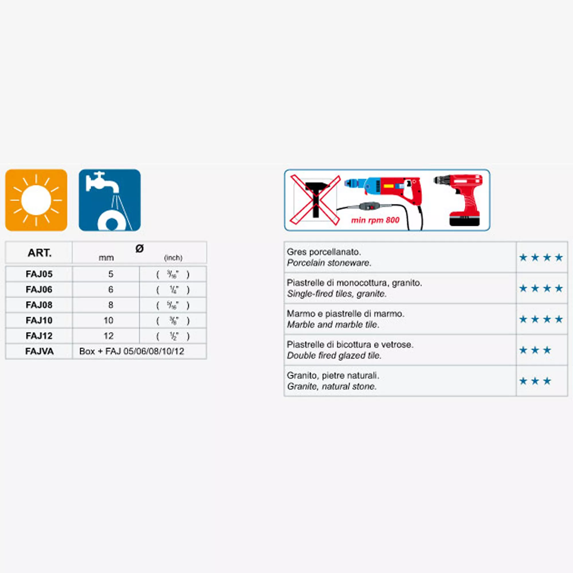 Jeśli chcesz używać diamentowego wiertła rdzeniowego, potrzebujesz wiertła obracającego się z prędkością co najmniej 800 obr./min. Wiertło diamentowe Mondrillo jest dostępne w 5 różnych rozmiarach. Klient może wybierać pomiędzy średnicami 5, 6, 8, 10 i 12 mm. Tego typu narzędzia diamentowe są uważane za szczególnie twarde i przeznaczone do różnorodnych zadań. Chociaż to narzędzie diamentowe nadaje się do wiercenia na sucho, istnieją inne narzędzia, których można używać do wiercenia na mokro. Kupując wiertło i narzędzie diamentowe należy zwrócić uwagę na wysoką jakość i bezbłędne wykonanie. Przedstawione tutaj narzędzie powinno być obsługiwane z odpowiednią lub kompatybilną wiertarką.